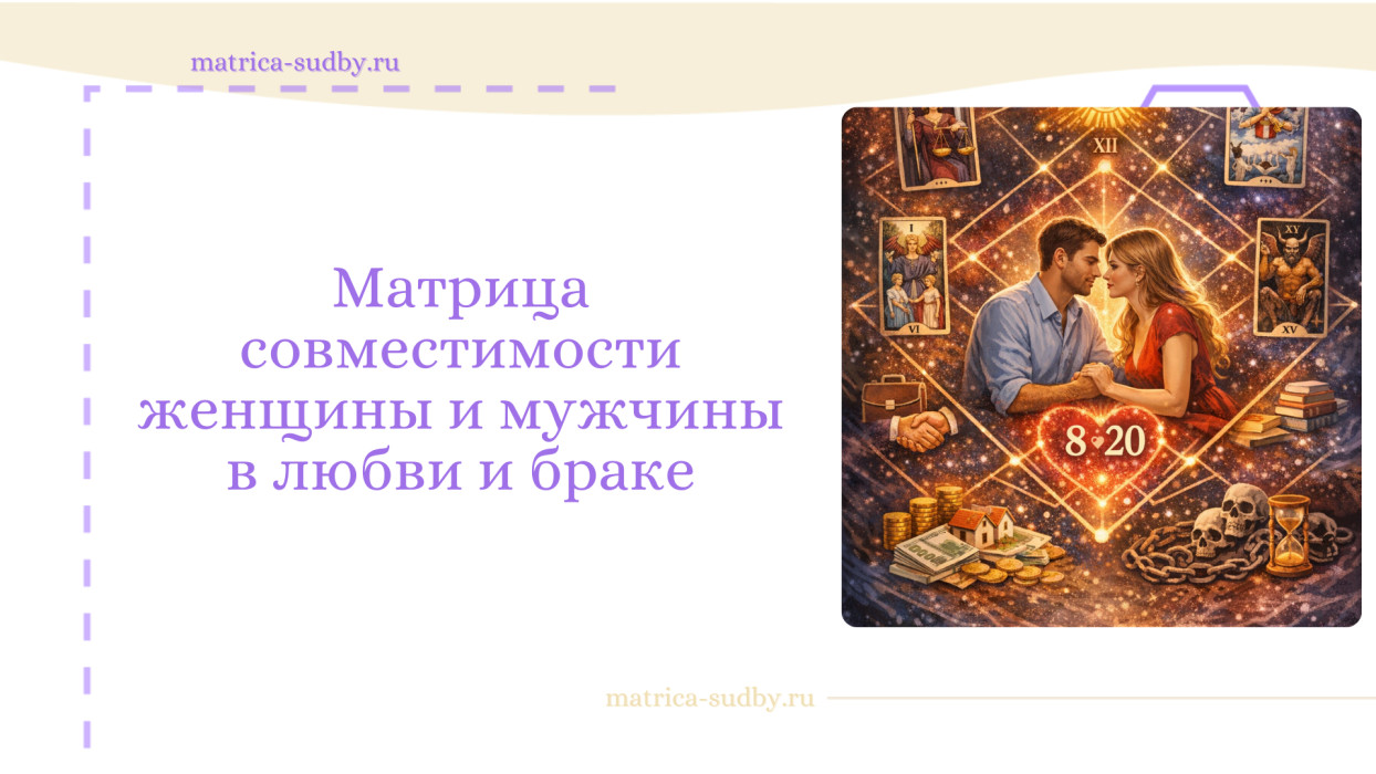 Наш бесплатный калькулятор для онлайн-расчета совместимости Матриц — это простой и быстрый способ понять динамику отношений по датам рождения партнеров. Вы узнаете, что означают арканы, влияющие на пару, и как перевести их из минуса в плюс. Это поможет разобраться в потенциальных проблемах и укрепить отношения.